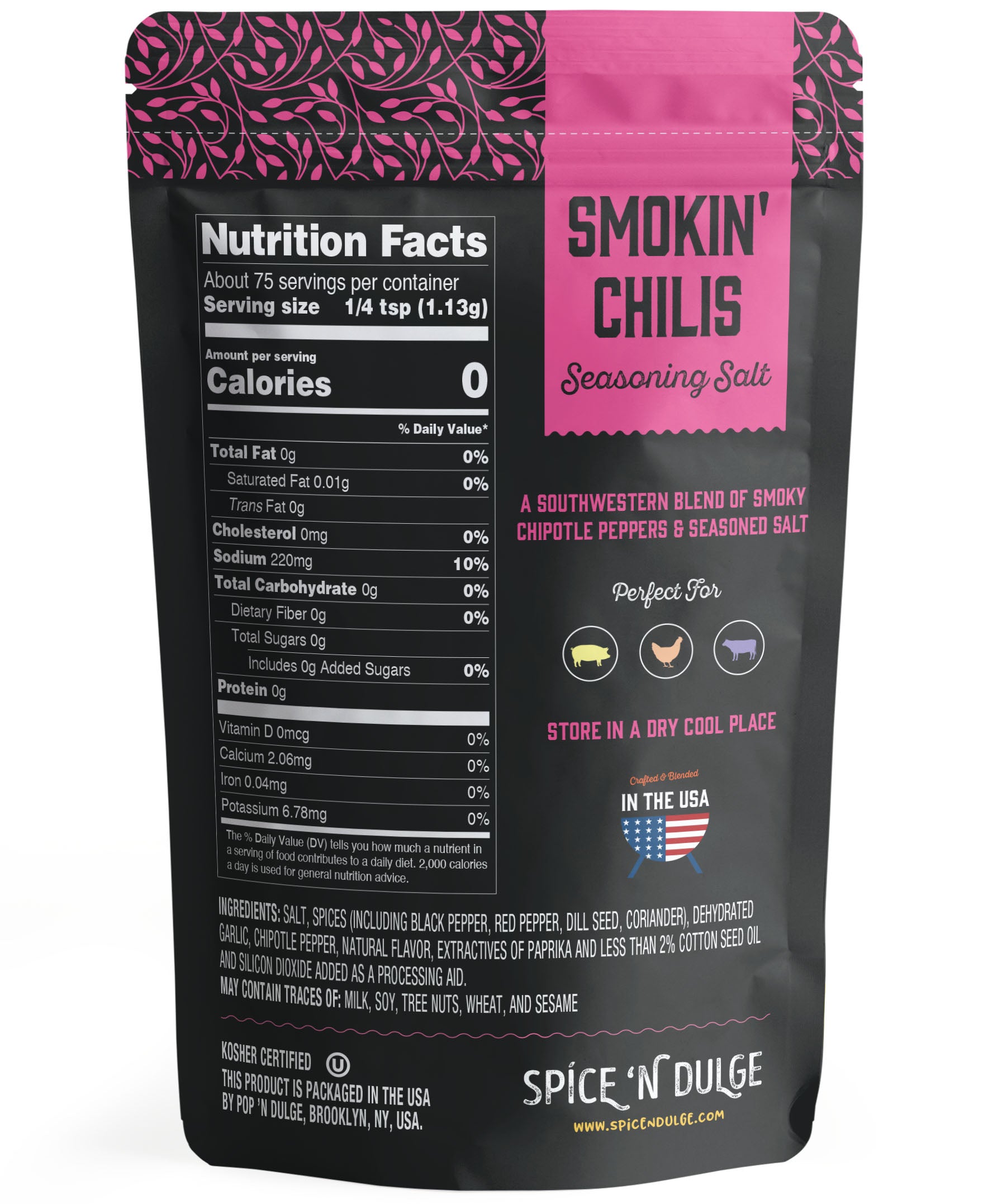 Deep smoky chipotle flavor with savory seasoning salt. Smokin’ Chilis adds barbecue character and gentle heat to meats and vegetables, giving food a grilled taste even when cooked indoors.