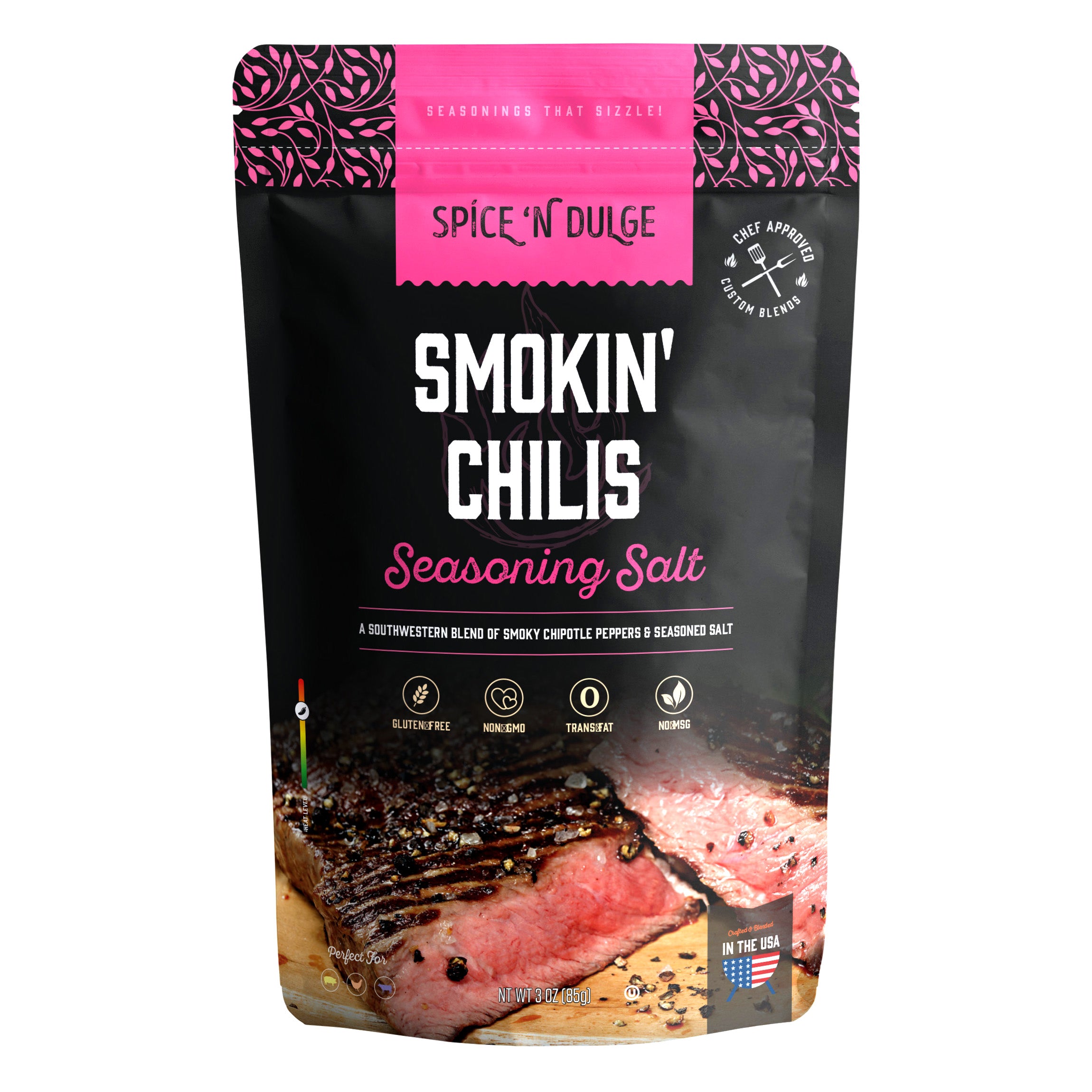 Deep smoky chipotle flavor with savory seasoning salt. Smokin’ Chilis adds barbecue character and gentle heat to meats and vegetables, giving food a grilled taste even when cooked indoors.